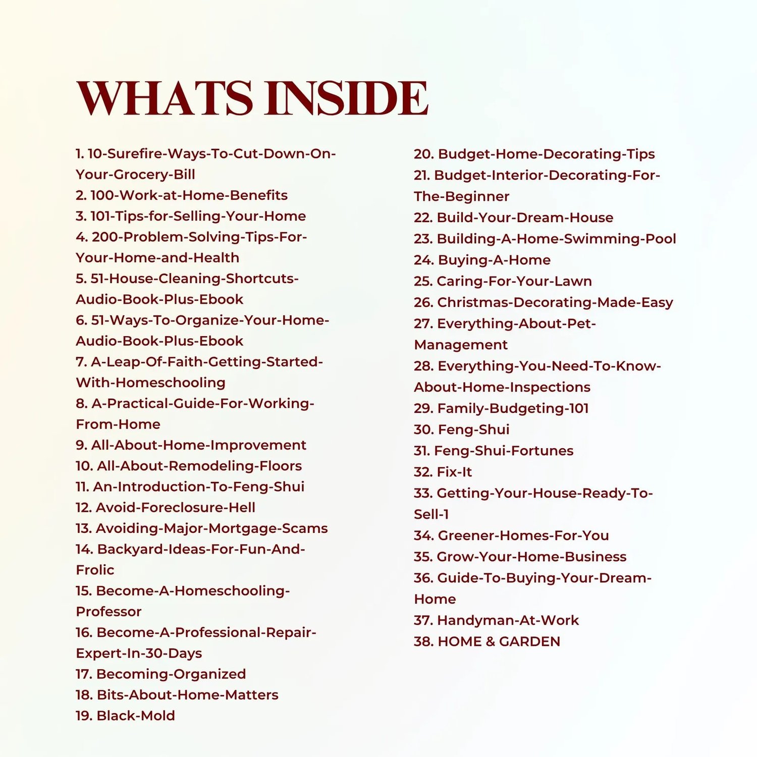 Transform your home and turn your passion into profit with this ultimate 100+ Home and House eBook Bundle! Whether you're a homeowner, renter, interior design lover, or DIY enthusiast, this digital collection offers expert tips, step-by-step guides, and creative inspiration to help you elevate every corner of your living space.